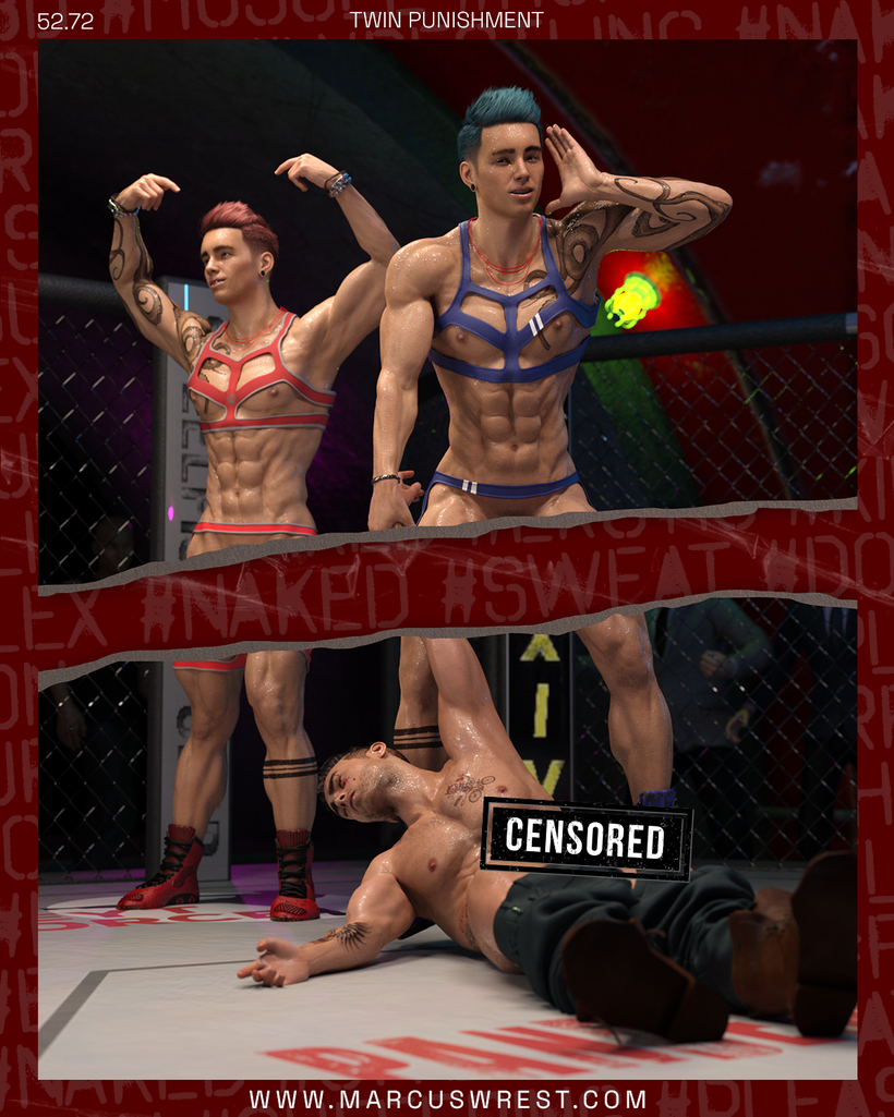 The twins are about to drag the losers out of the cage but the crowd screamed for more! The mysterious announcer gives them 15 extra minutes in the cage to dish out punishment.